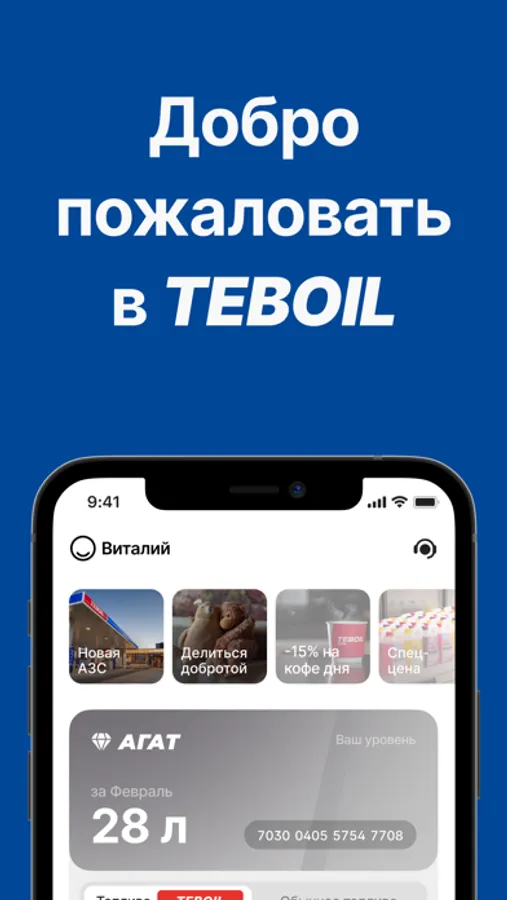 В приложении вы сможете отслеживать свой уровень в Программе лояльности, управлять данными в настройках профиля, проверять баланс карты и историю визитов на наши АЗС. Участвуйте в акциях и получайте персональные предложения. Также Вам будут доступны вкусные предложения от Teboil Café, карта АЗС и возможность самостоятельно построить маршрут до ближайшей АЗС.