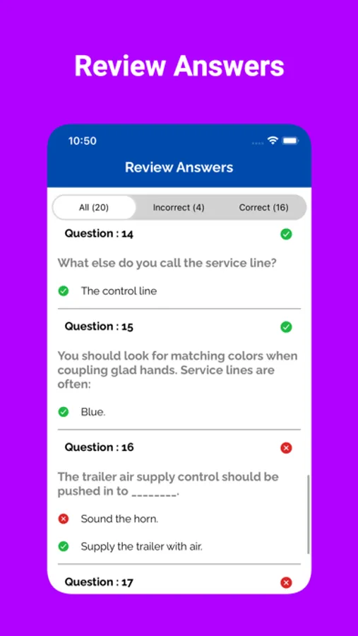 Our app includes a variety of practice questions for the Driver's license exam for Commercial Vehicles. These questions are based on the official handbook of different states.