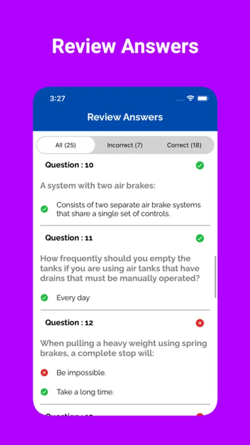 Our app includes a variety of practice questions for the Driver's license exam for Commercial Vehicles. These questions are based on the official handbook of different states.