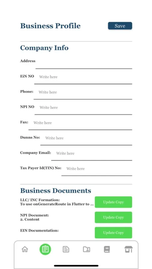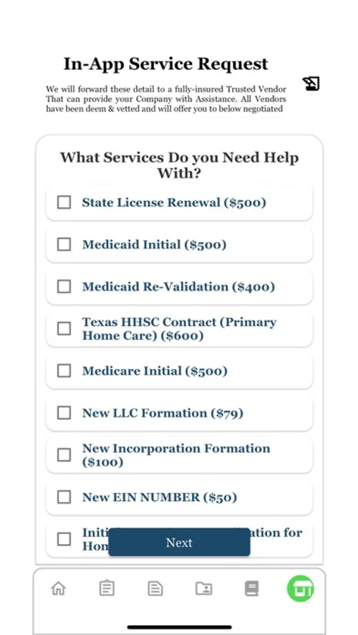 Now you Never have to worry about leaving your important business documents or business information behind. Your Corporation/LLC, Your EIN, Insurance Policies, ect are all imbedded right in the app and is easily accessible and sharable if need be.