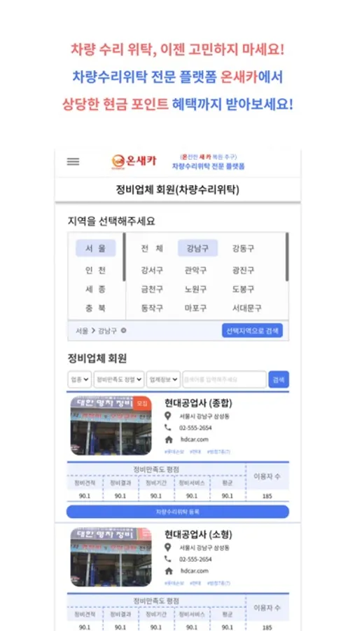 온새카 모바일에서는 정비업체의 각종 정비관련 정보를 조회하여 차량수리위탁(포인트 적립)을 할 수 있고, 참여마당·공지사항 등을 볼 수 있습니다.