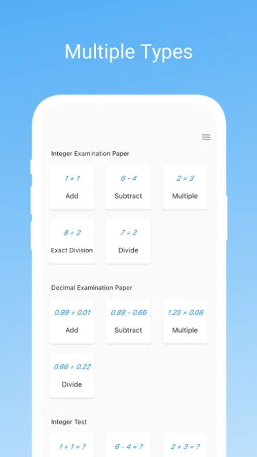 ∙ Math test: Customize the time limit, operation types and so on to generate challenge questions.