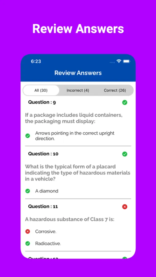 Our app includes a variety of practice questions for the Driver's license exam for Commercial Vehicles. These questions are based on the official handbook of different states.