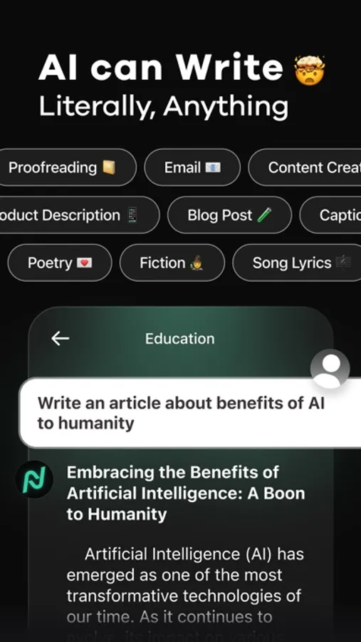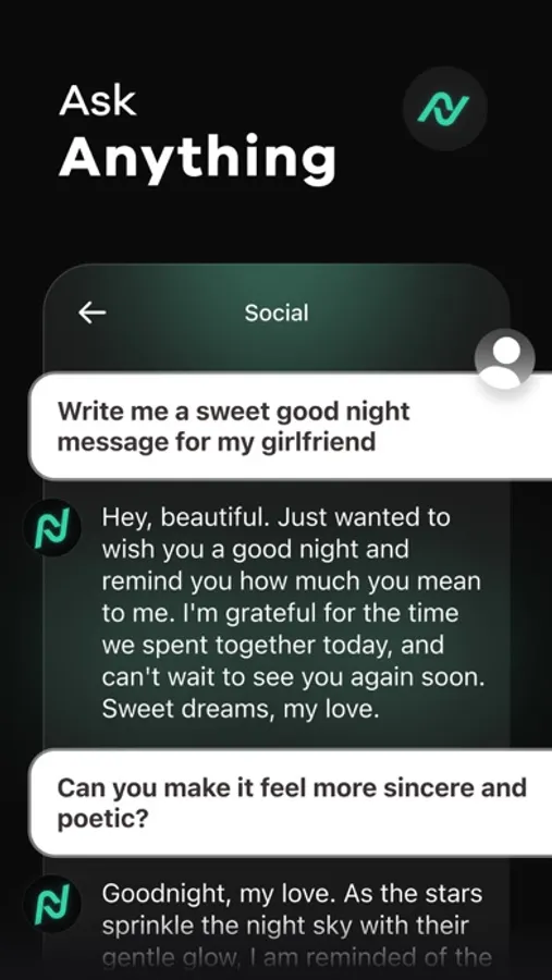 With Nova, you have access to personalized assistance for all types of writing projects, whether it is essays, compositions, social media posts, or poems. Basically, the app can assist with any task, such as crafting a unique and unforgettable pickup line or even creating an original song. That’s right! This AI helper is not only smart but also creative. Let your imagination run free with it!