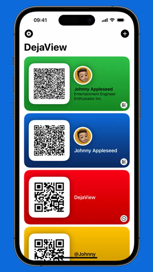 Select your contact, choose which fields to include in your card and its QR code - and you’re done. Whenever you make changes to your contact, they are automatically reflected in DejaView as well. So, forget about forgetting to update your business cards.*