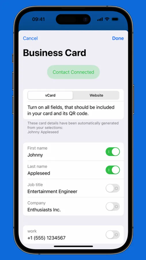 For this reason, DejaView works without any external dependencies or servers involved. When you choose to create a vCard QR code, your contact information is included in the QR code itself – eliminating the need for an internet connection when scanning the code.