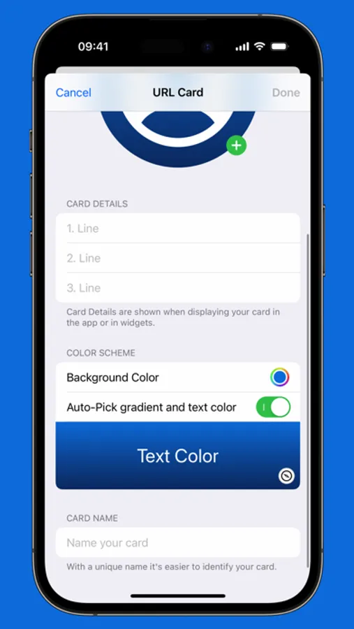 Create a stunning card easily: select a picture and choose your favorite background color, gradient color, and text color. This only affects your card’s design – the selected picture won't be part of the QR code due to technical limitations.