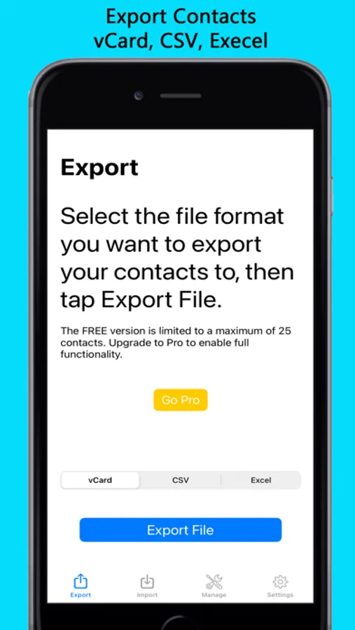 Export your iPhone contacts in vCard, CSV or Excel format.