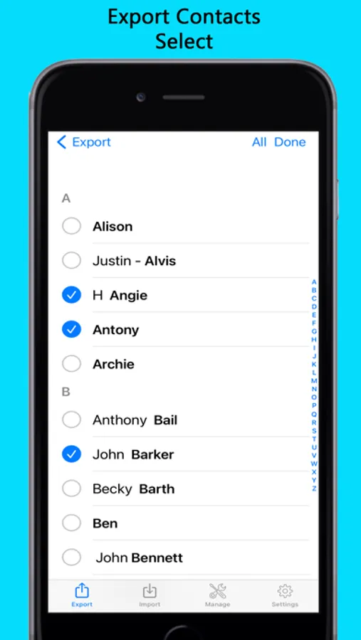 The must have App to Export your iPhone contacts; no sign-up required, no adverts and 100% private.