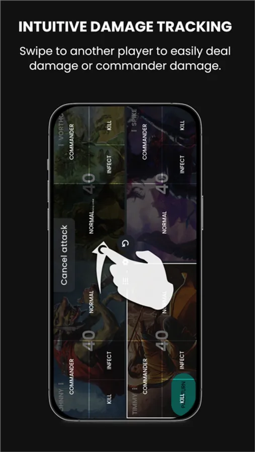 + Intuitive UI: By using a combination of swiping gestures (swipe towards the player that you want to damage) and tapping (tap for 1 life or hold for 10 life) tracking takes little effort.