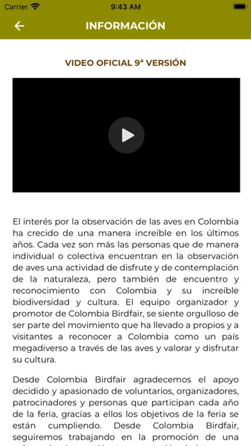 El interés por la observación de las aves en Colombia ha crecido de una manera increíble en los últimos años. Cada vez son más las personas que de manera individual o colectiva encuentran en la observación de aves una actividad de disfrute y de contemplación de la naturaleza, pero también de encuentro y reconocimiento con Colombia y su increíble biodiversidad y cultura. El equipo organizador y promotor de Colombia Birdfair, se siente orgulloso de ser parte del movimiento que ha llevado a propios y a visitantes a reconocer a Colombia como un país megadiverso a través de las aves y valorar y disfrutar su cultura .