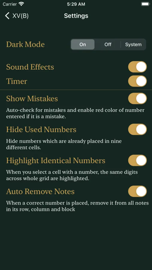 - Auto removal of notes settings : When a correct number is placed, remove it from all notes in its row, column and block.