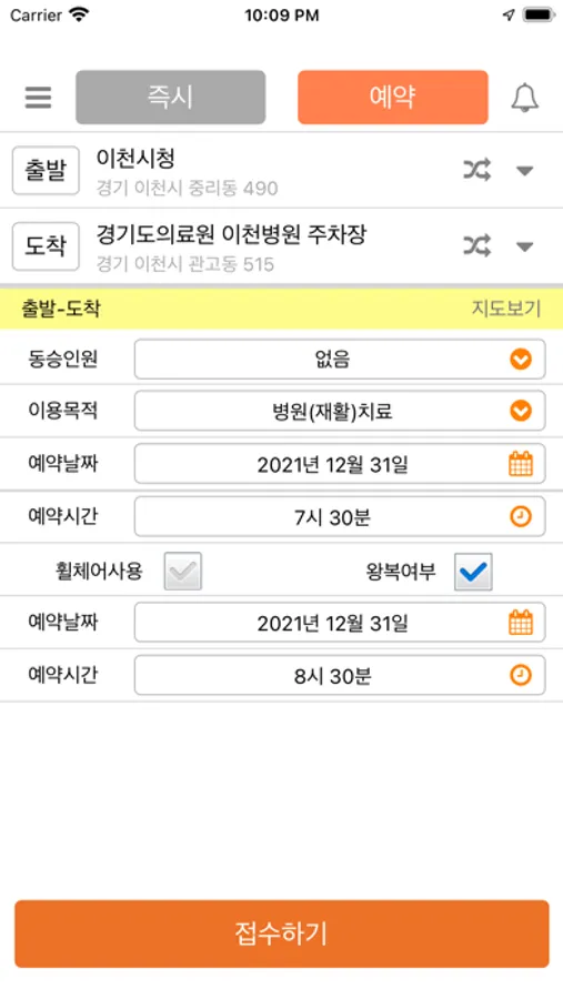 ※ 병원, 재활, 치료, 학교목적의 이용 시 일반 목적보다 1일전부터 접수 가능