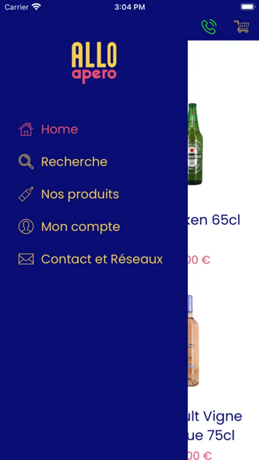Vins, bières, champagnes, cocktails, rhums, vodkas, gins, whiskys, tequilas, cognacs, liqueurs, softs, apéritifs et snacks livrés chez vous en 30min !