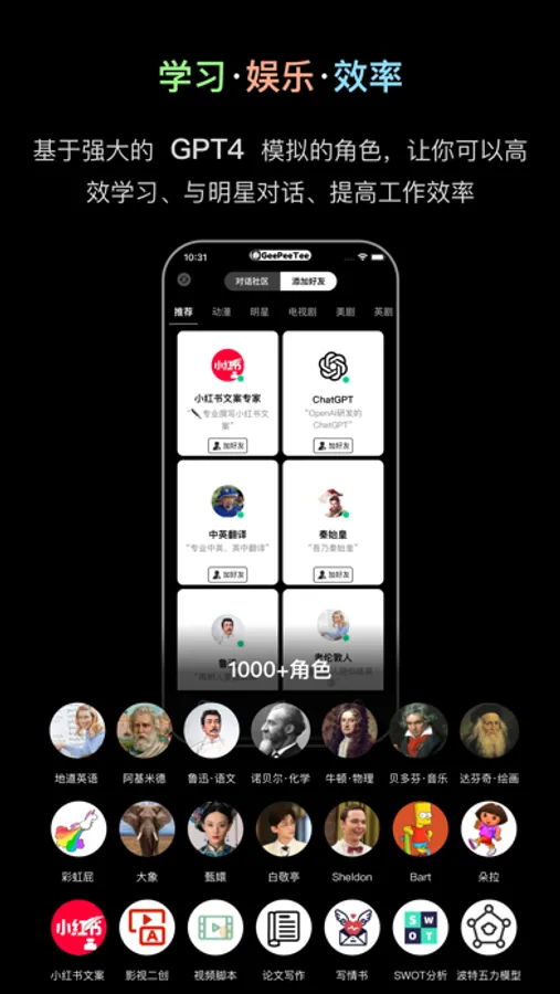 GeePeeTee,由openAI提供的GPT会话能力,模拟各种角色,使用最新的GPT-4,无需翻墙或vpn可直接下载使用。可以学习、提高效率、娱乐。
