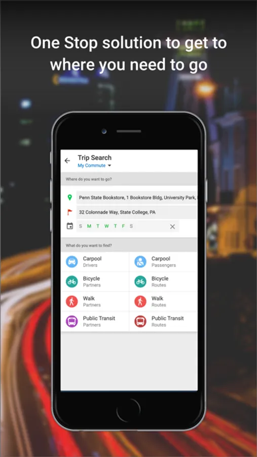 RideOn is a free ride-matching and trip-planning platform available exclusively to Penn State faculty, staff, and students to help get to, from, and around campus.