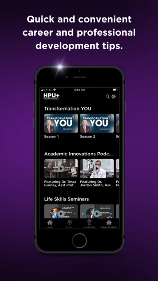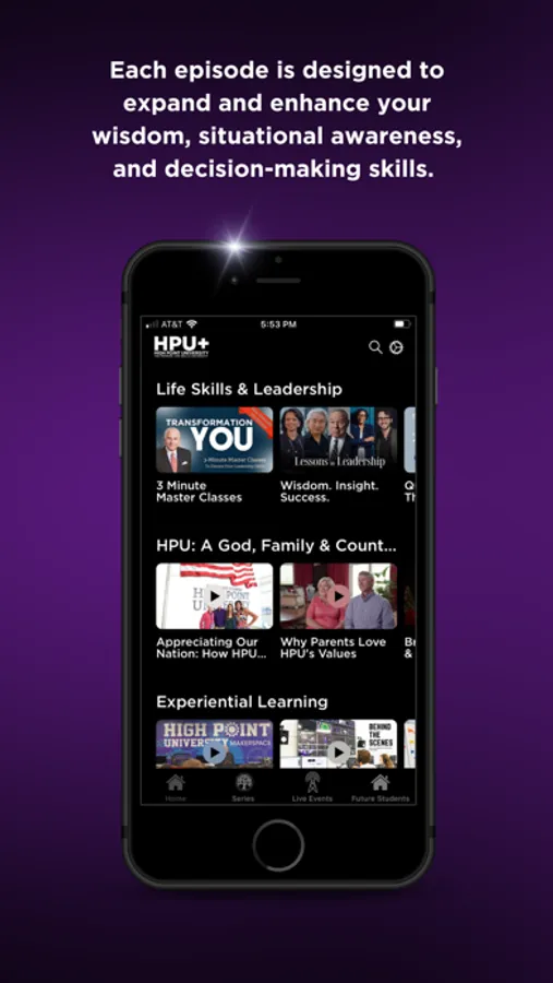 High Point University is respected for its focus on Life Skills and leadership development. This complimentary streaming app features the professional development series “3-Minute Master Class” with HPU President Nido Qubein - a power-packed life skills series to help you develop wisdom, distinction and awareness as a leader (new episodes launch weekly).