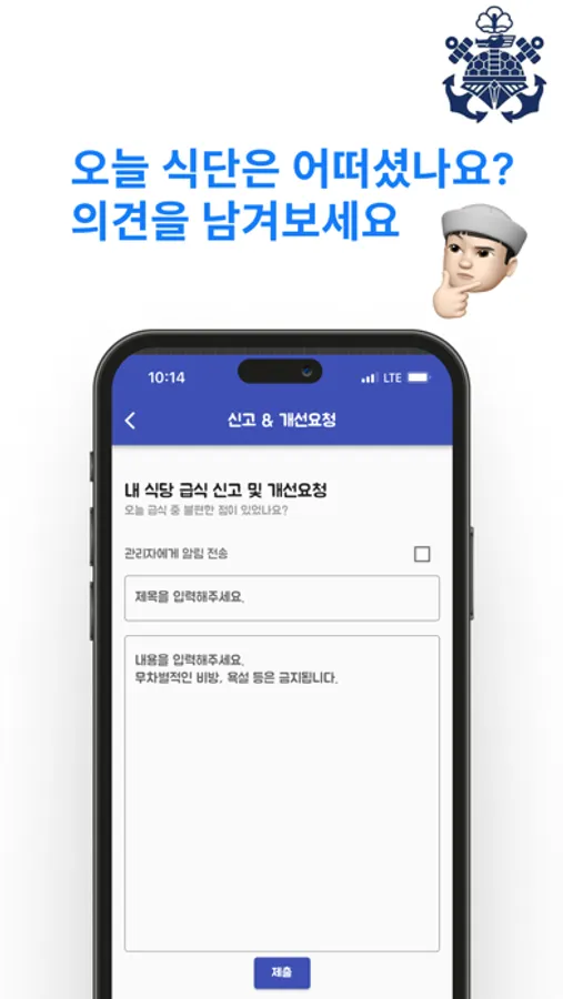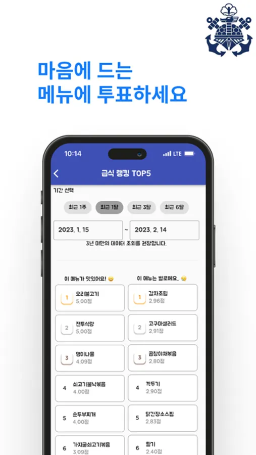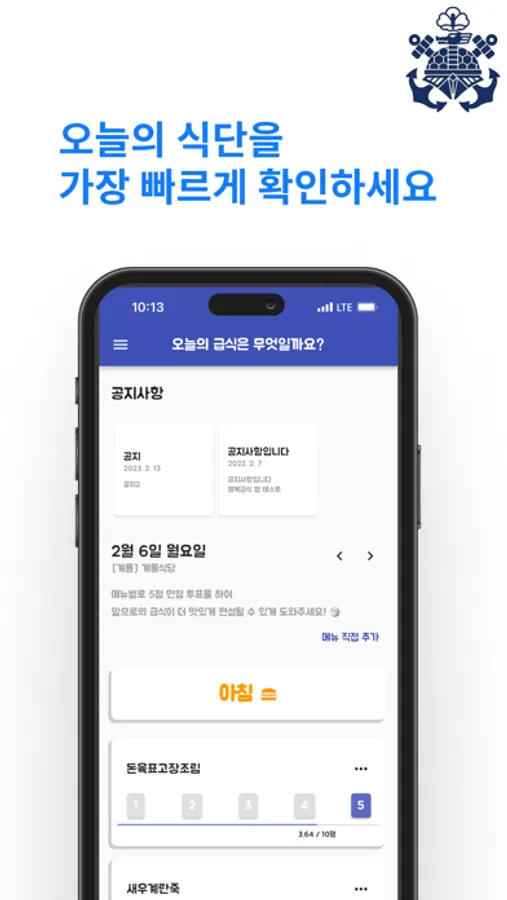 해군 행복급식 앱은 해군 영내식당 메뉴 조회, 선호도 투표, 식당 관리 등의 기능을 제공합니다 . 빠르고 편리하게 메뉴를 확인하고 식당 공지시항을 알림으로 받아보세요.