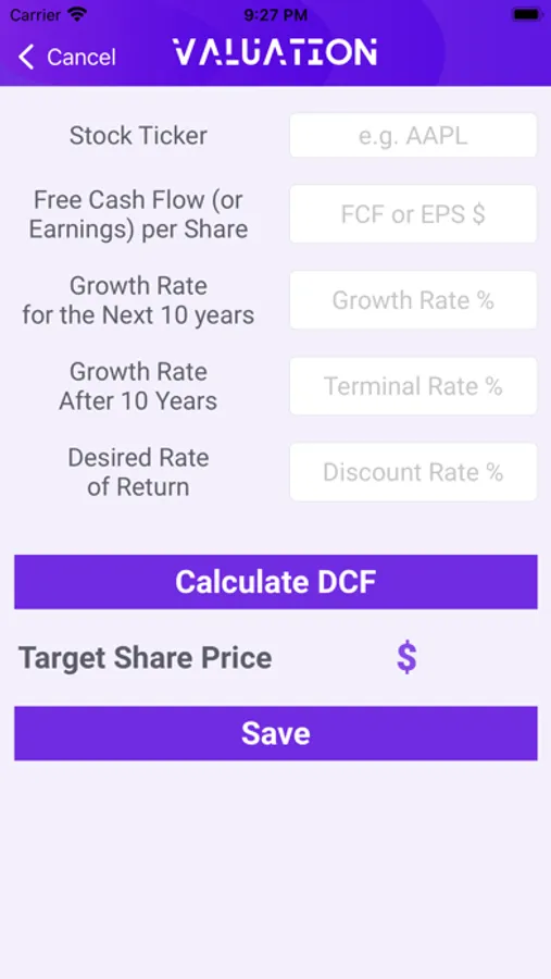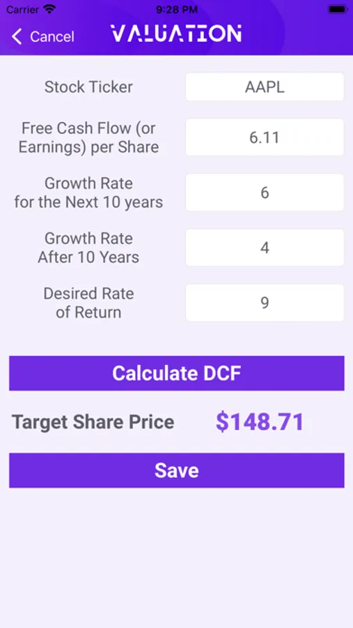 This app can help you estimate the value of a company such that it can be compared to the current market price. The valuation can also be done on a corporation as a whole, or on a per-share basis, depending on whichever values are entered.