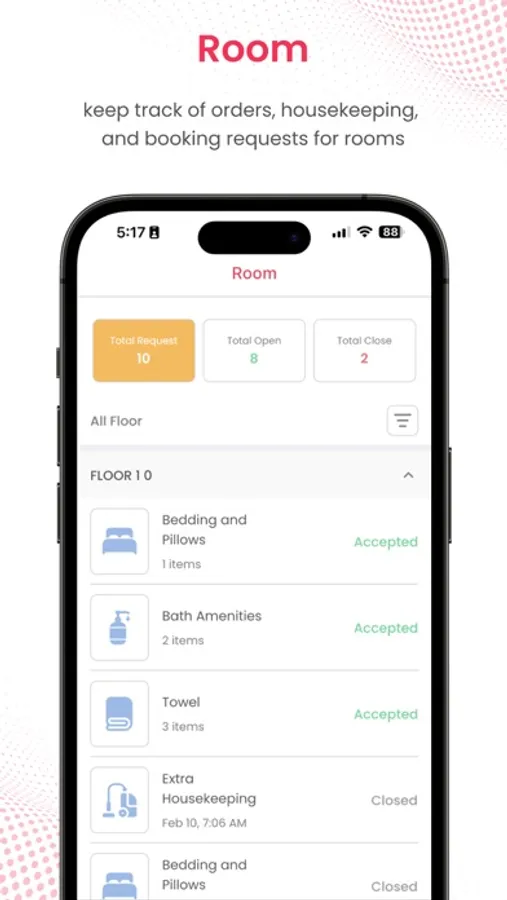 - Room : keep track of orders, housekeeping, and booking requests for rooms.