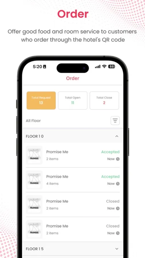 - Order : offer good food and room service to customers who order through the hotel's QR code.