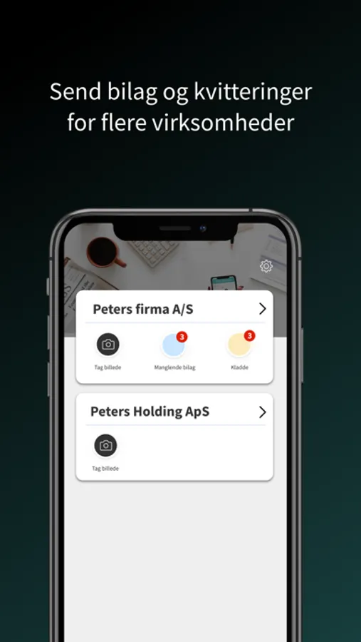 Du kan tage billeder af dine bilag eller fakturaer og sende dem direkte til din bogholder med mulighed for at vælge afdeling, projekt, årsag og betalingsmetode.
