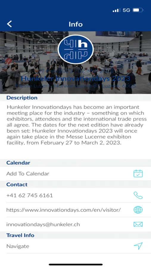 Optimize your visit to the Hunkeler Innovationdays with the the Hunkeler Innovationdays app. With our app, you can find all important information quickly and easily in one place before, during and after the trade fair. Thanks to the many functions, you can prepare for the event in the best way possible and concentrate on the things that are important to you during the show. Use this app and experience the Innovationdays digitally. All important information about Hunkeler Innovationdays 2023 is displayed in the app. The app offers information on Opening hours, directions, products, contacts, and much more. In addition, you will find the most important links to hotels, traffic and registration. The Hunkeler Innovationdays app is the comprehensive source of information for all questions about the event.