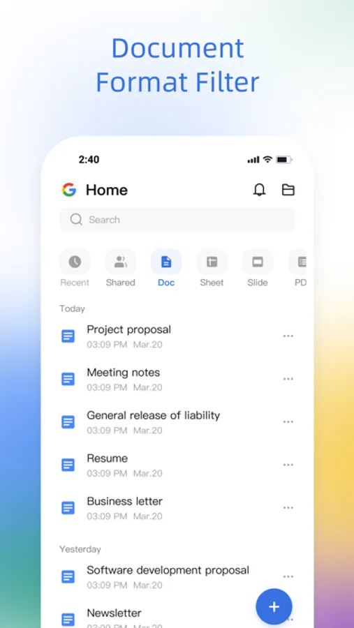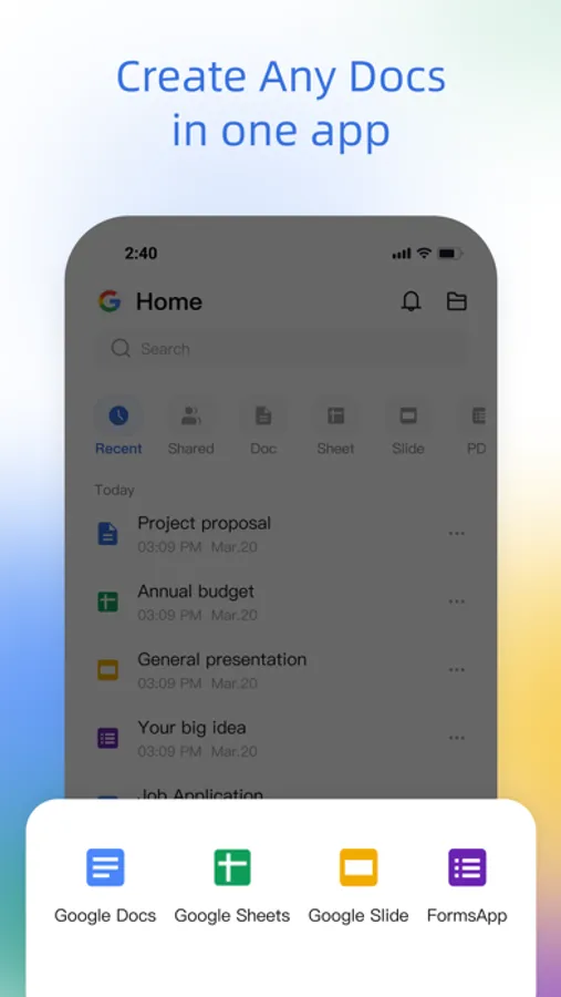 • View and share all kinds of Google Docs, Sheets, Slides, Forms in one place. It's Quick and Easy Access.