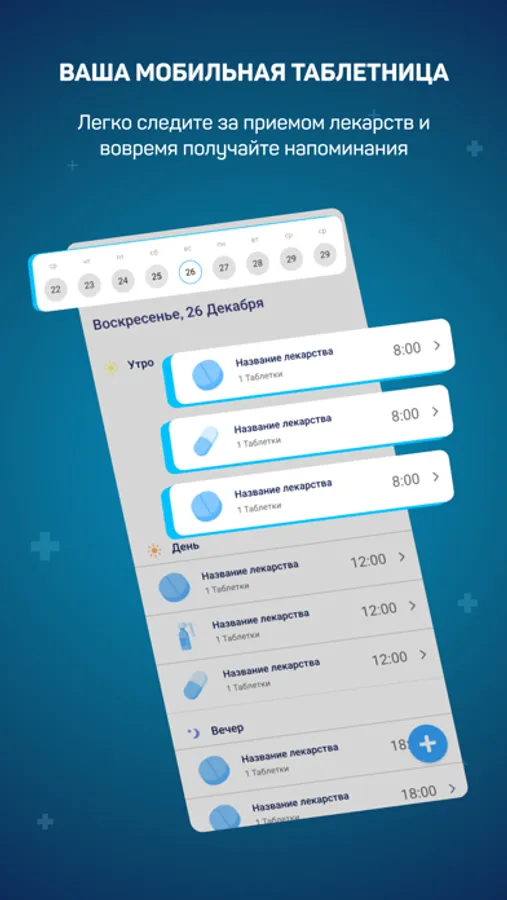 Создавайте курсы лечения : устанавливайте дозировку, дни приема лекарственных препаратов и процедур. Следите за всеми своими курсами лечения и вовремя получайте уведомления.