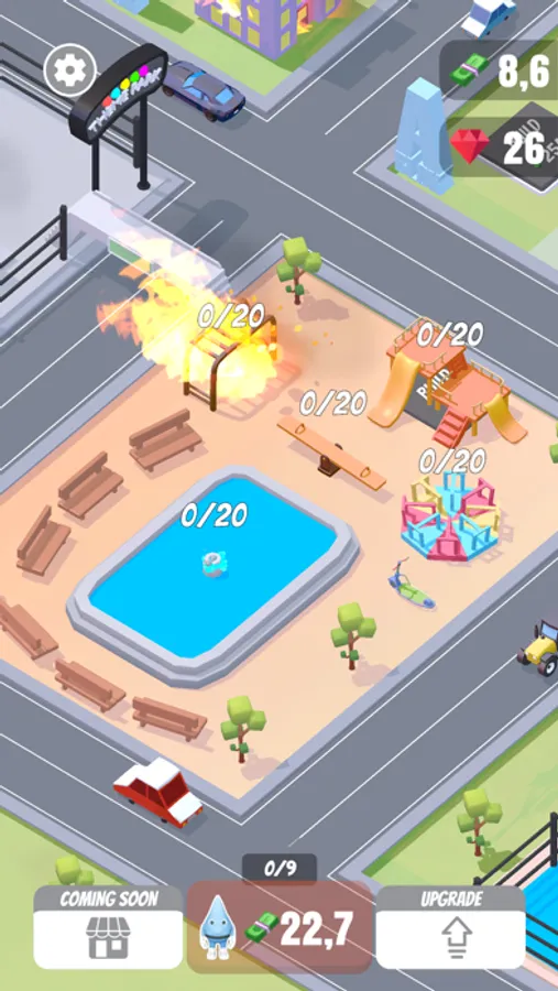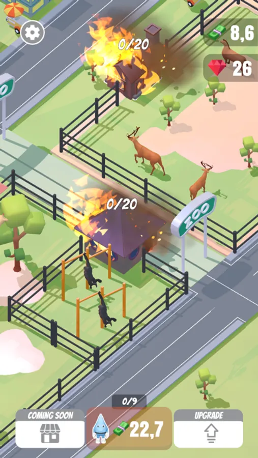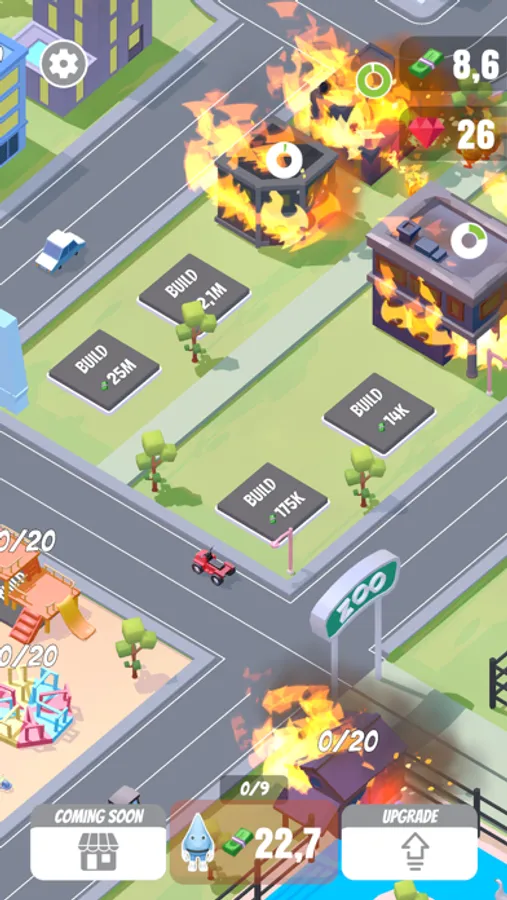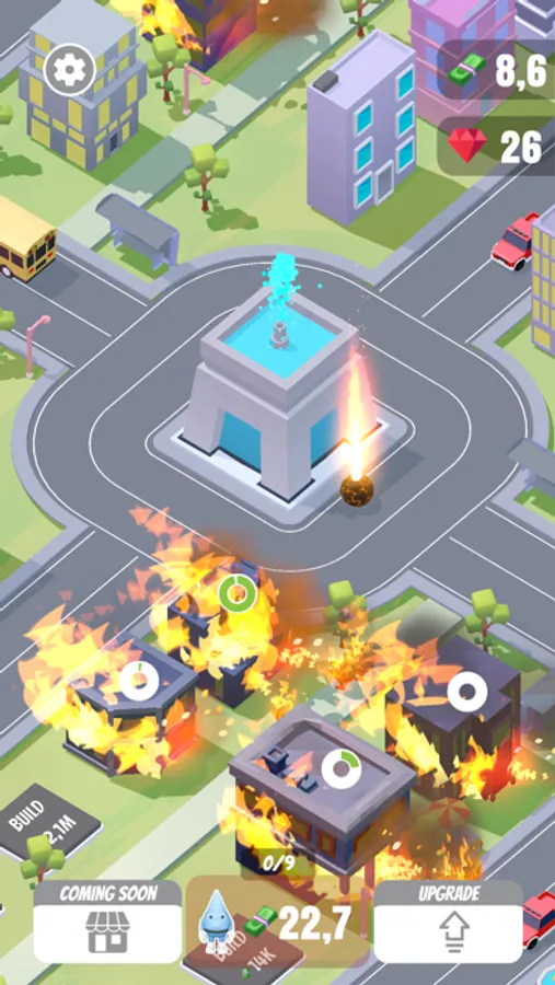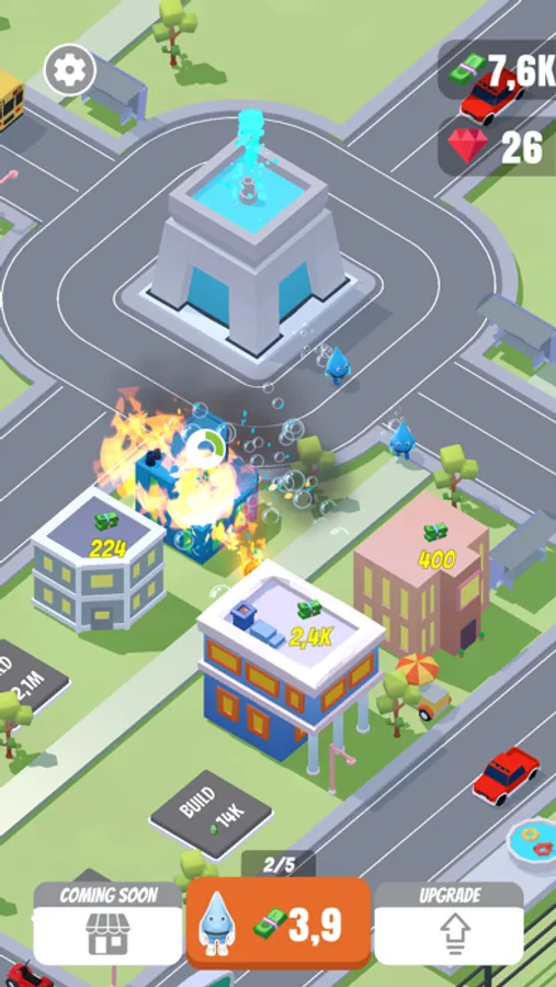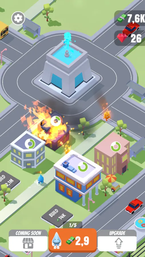 Welcome to a brand new click game. The city is on fire and needs your help to put it out. Produce as many drops of water as possible by operating a water production center. Unlock buildings, put out the fire to earn money. Upgrade buildings, increase income. Enjoy the entertainment center and zoo. Can you save the whole city before the animals burn first?