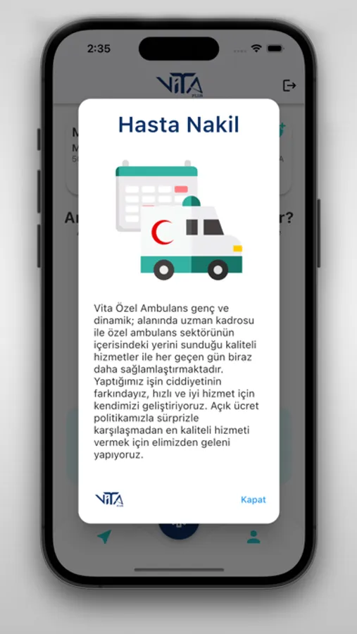Vita Özel Ambulans Hizmetleri İstanbul’un birçok noktasında bekleyen veya hareket halinde ambulanslarımızla hizmet vermekteyiz. Alanlarında düzenli eğitim alan, diplomalı ve sertifikalı doktor, uzman doktor, paramedik, acil tıp teknisyeni, anestezi teknikeri ve ilk yardım eğitim sertifikalı sürücülerimizle sizlere güvenilir ve kaliteli hizmet sağlamak için çalışıyoruz. Konularında eğitimli uzman ekibimiz bayram gibi özel günler dahil olmak üzere 7/24 çağrı sistemi, eğitimli çağrı karşılayıcı personeli, kayıt sistemi, adres bulma sistemi ve araç takip sistemleriyle size daha kaliteli hizmet vermek için çalışıyor. Size daha iyi hizmet verebilmek için ekibimiz düzenli eğitimler almaktadır.
