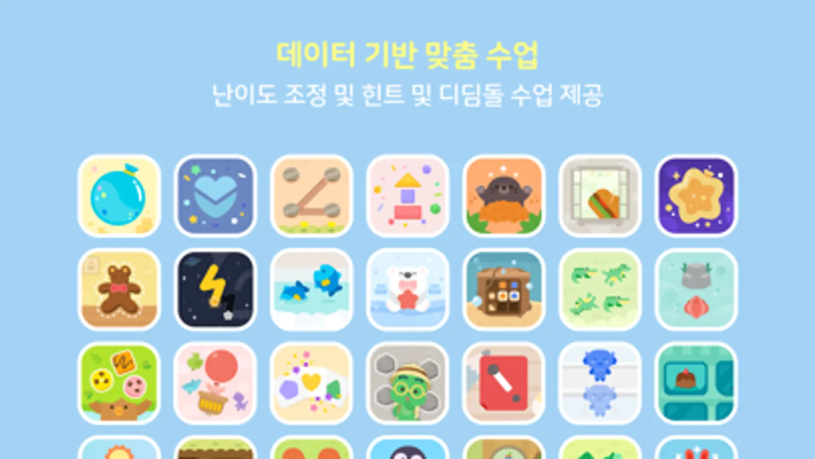 - 아이의 문제 풀이 데이터 기반으로 잘하는 것은 난이도를 올려서, 어려워하는 것은 난이도 조정은 물론 힌트 추가 및 디딤돌 수업을 통해 차근차근 아이가 따라올 수 있도록 합니다.