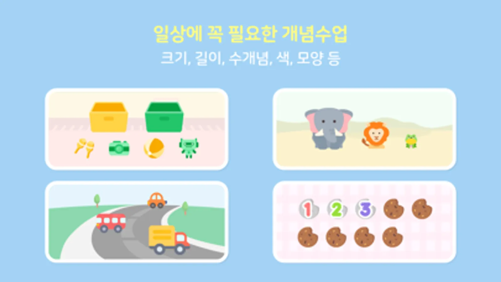 - 일상 생활에서 꼭 필요한 크기, 길이, 수, 색, 모양 등의 기초 개념을 다루는 수업도 마음껏 연습할 수 있습니다.