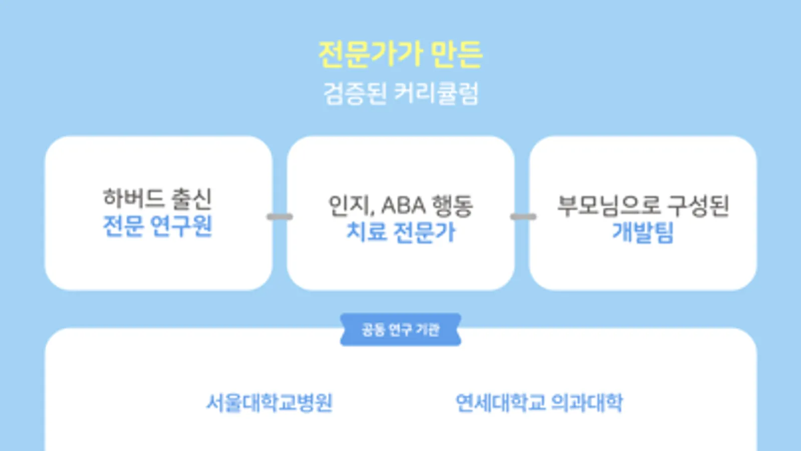- 하버드 출신 전문 연구원, 인지, ABA 행동 치료 전문가, 부모님으로 구성된 개발팀이 함께 만들었습니다.