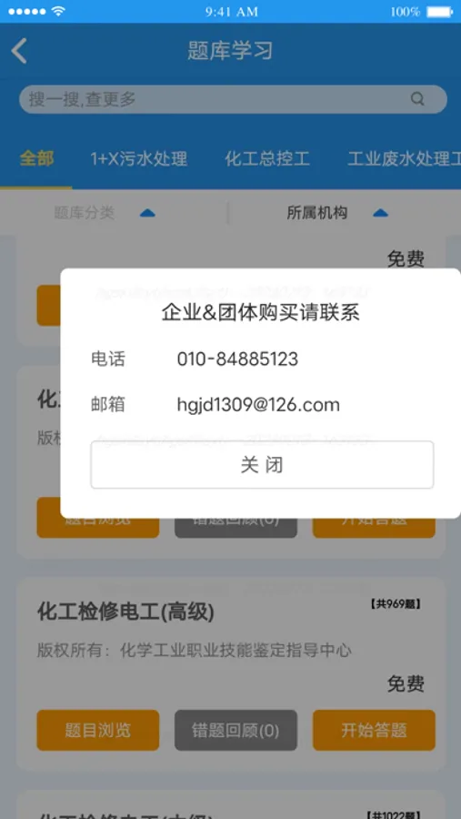 APP内设有化工总控工、仪器仪表维修工、化学检验员、工业废水处理工、有机合成工、制冷工、化工检修钳工、化工检修电工、无机化学反应生产工、压缩机操作工、水生产处理工等20个职业(工种)题库,是化工人考试鉴定、赛前训练必备宝典。