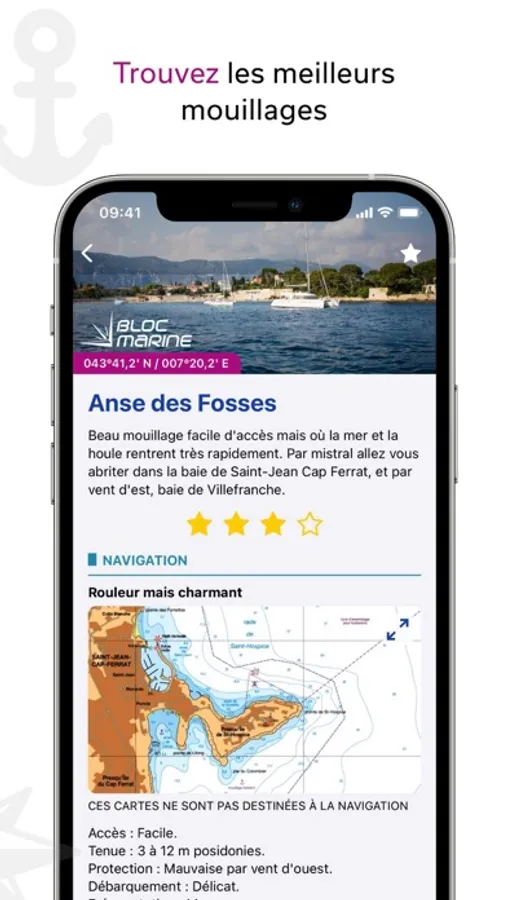 • des fiches sur les mouillages pour vous aider à choisir le plus adapté pour vous en fonction de leurs caractéristiques : accès, tenue, protection, débarquement, fréquentation...
