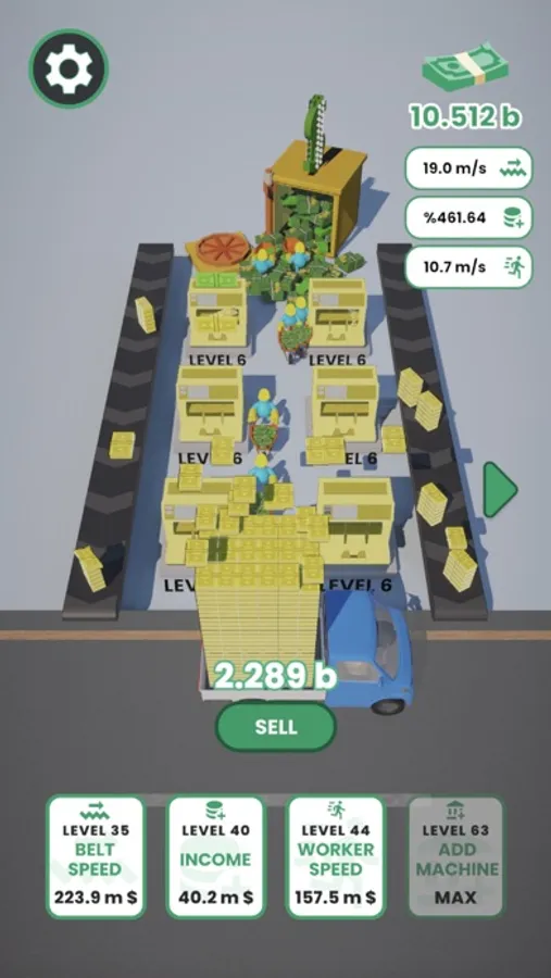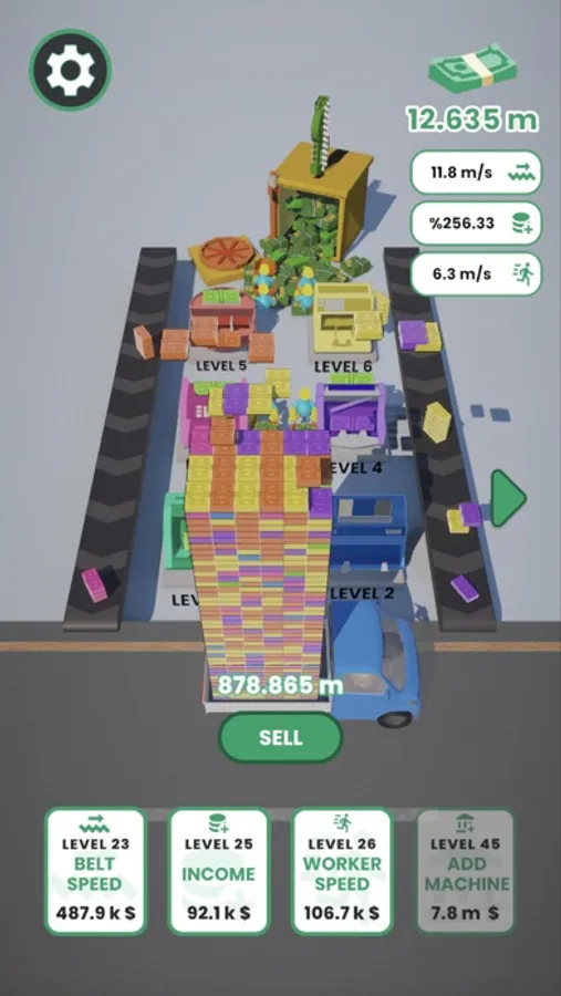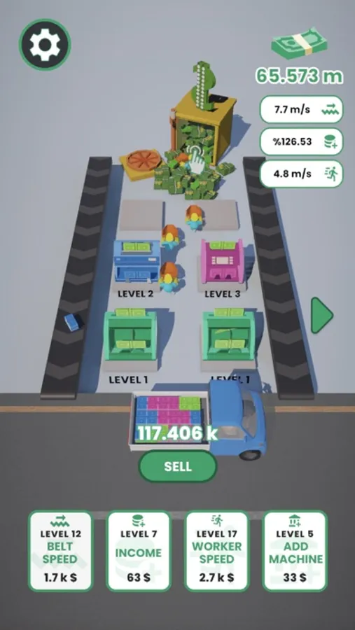 Add machines to your precious money counter factory and count BIG amounts of money. Merge machines to get the next level machines. Use your money wisely. Your little workers transports the money from safe to your machines. So treat them like a kind boss.