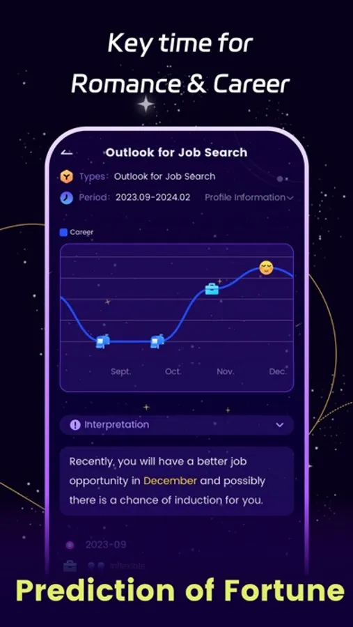 -If you are more concerned about your own future, you can check your life trends in Annual Forecast. The curve chart and text description will show your specific annual forecast analysed month by month, so that you can directly know the ups and downs of the next six months in advance. For example, when can you meet your love? Which month will high-paying jobs appear? Which month is suitable for you to get a new job?...