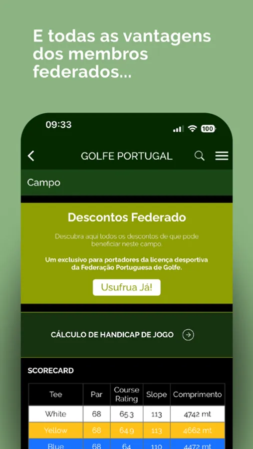 Ali poderá encontrar os contactos e os horários dos diferentes campos, calcular o seu handicap de jogo, conhecer o respetivo scorecard e até descobrir informações úteis e promoções únicas.