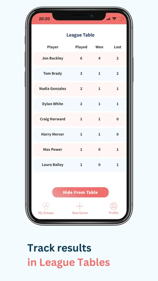 League Table - All players feature in a single League Table (unless they choose not to) showing wins, losses, games for and against, win rate and ranking
