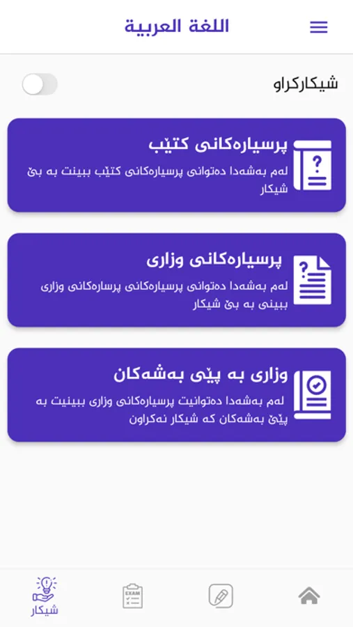 بۆ وانەی عەرەبی پرسارەکانی وزاری لە ساڵی 2017 وە بۆ خۆلی یەکەم وخولی دووەم و تەهمیدی واتا زیاتر لە 700 پرسیار بەردەستە و بەم زوانە هەزاران پرسیاری کتێب زیاد دەکرێت