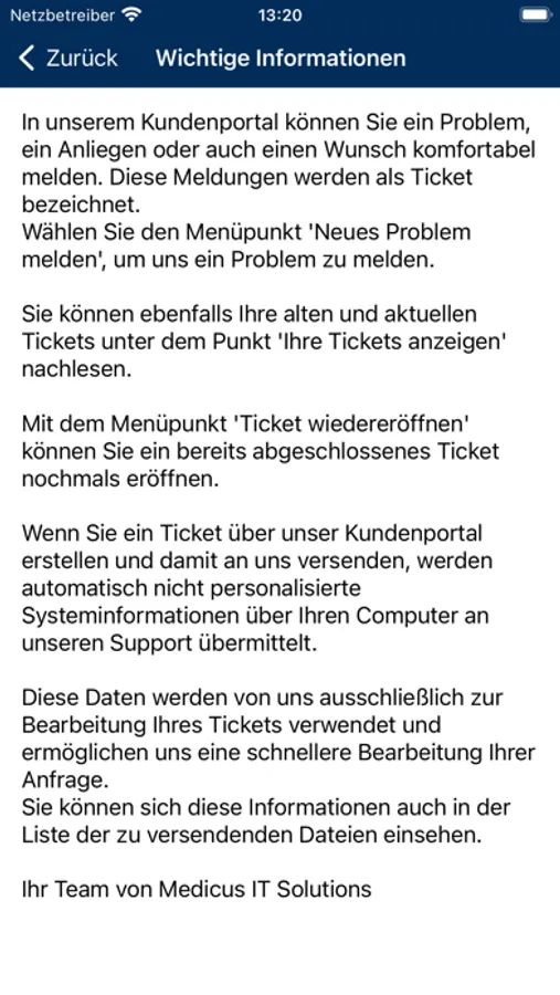 Mit dem Medicus IT Solutions Kundenportal können Sie von überall aus ein Ticket bei der Firma Medicus IT Solutions anlegen, Ihre Tickets verwalten und Tickets wiedereröffnen.
