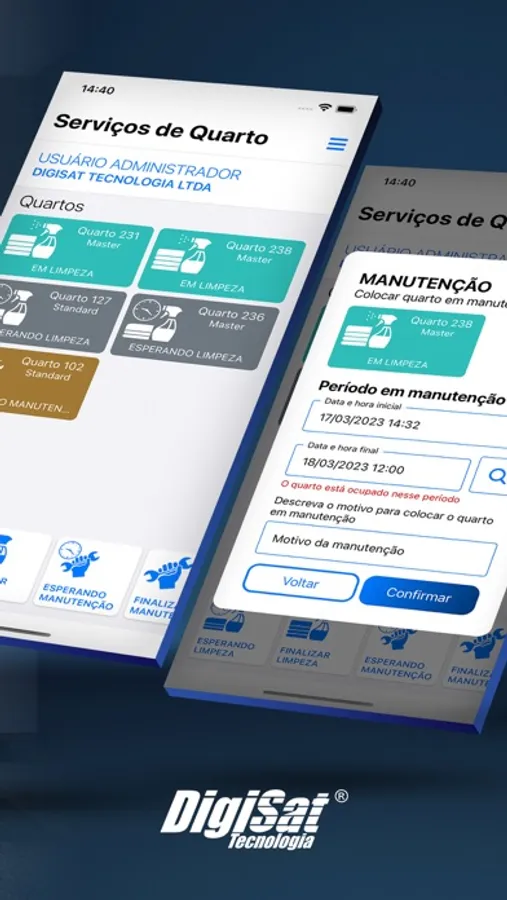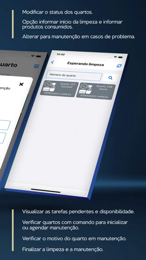 Já os técnicos podem verificar os quartos que precisam de manutenção, iniciando e finalizando os serviços necessários.