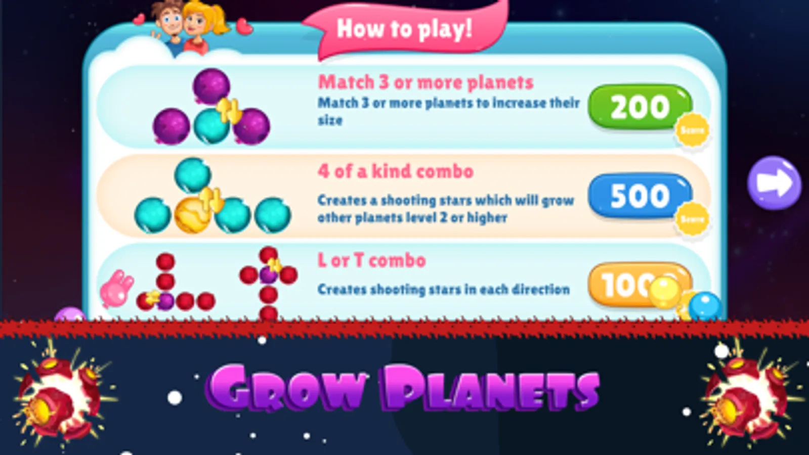 - Match 4, L or T’s to fire shooting stars which help grow other planets