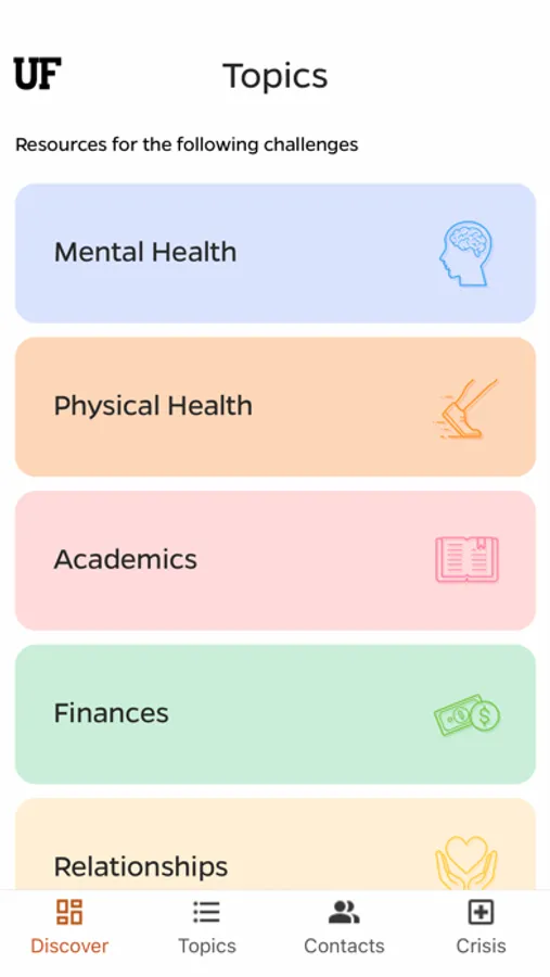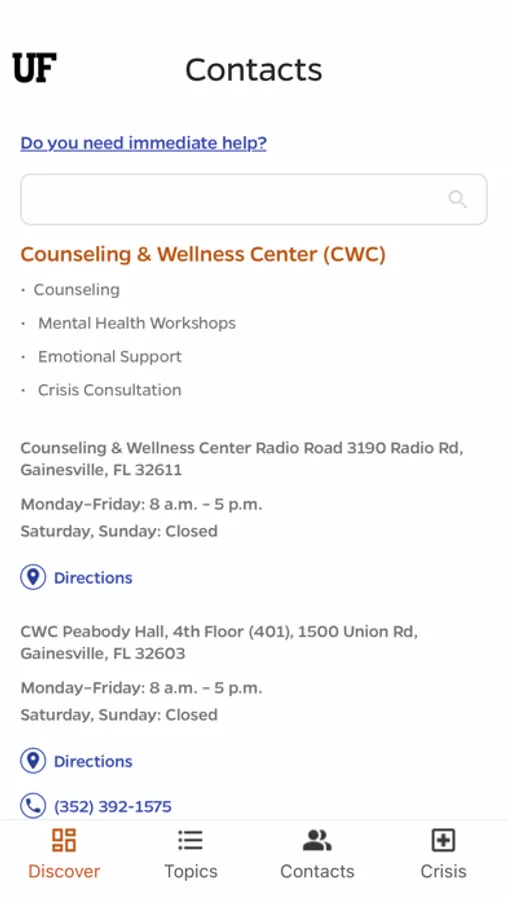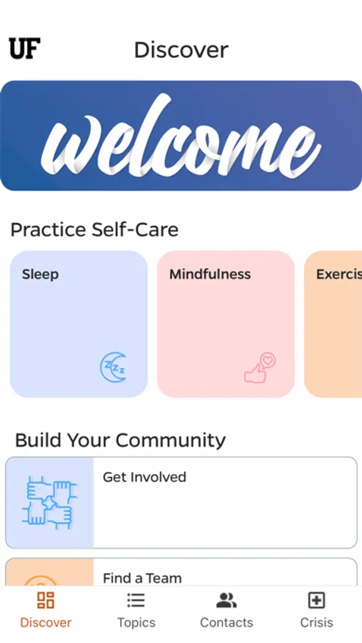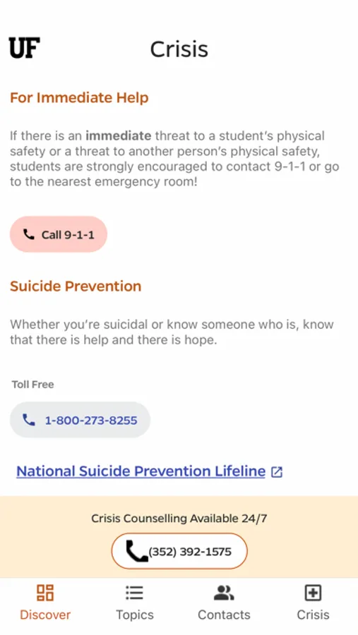 The Contacts and Crisis tabs provide straightforward suggestions for connecting you with the right resource. You can schedule an appointment with UF Counseling and Wellness Center and more from the app.