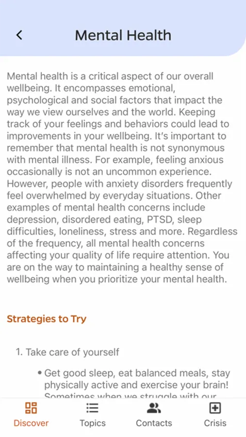 Discover ways to connect, Topics to learn more about, Contacts for local resources, and Crisis information for immediate needs.