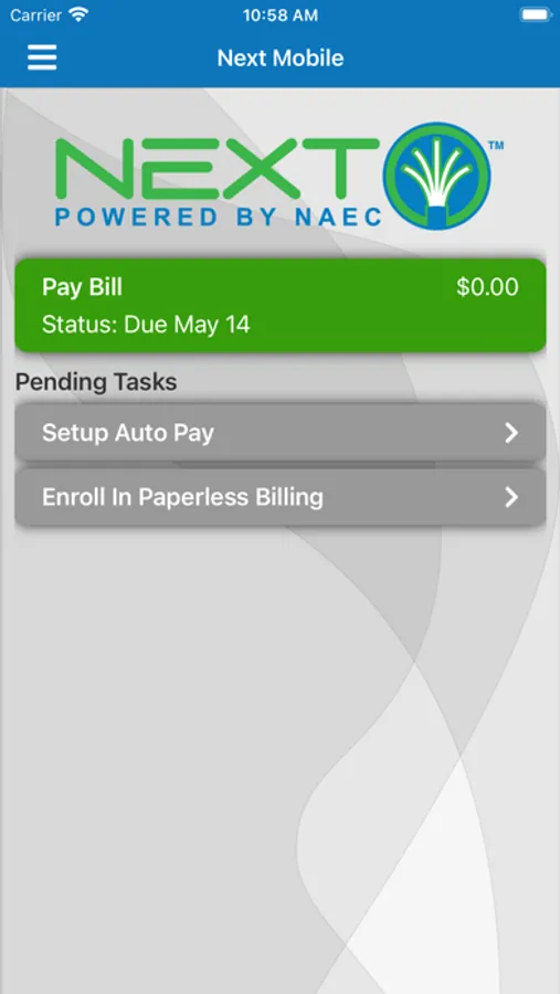 NEXT, Powered by NAEC's Mobile App provides a wide range of options for managing your account; reporting a trouble ticket, paying your bill, etc.