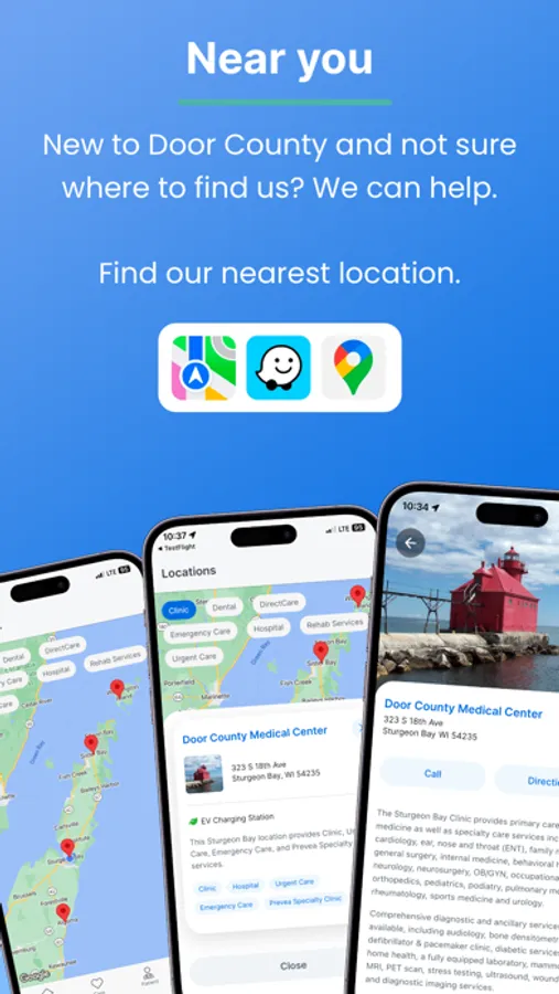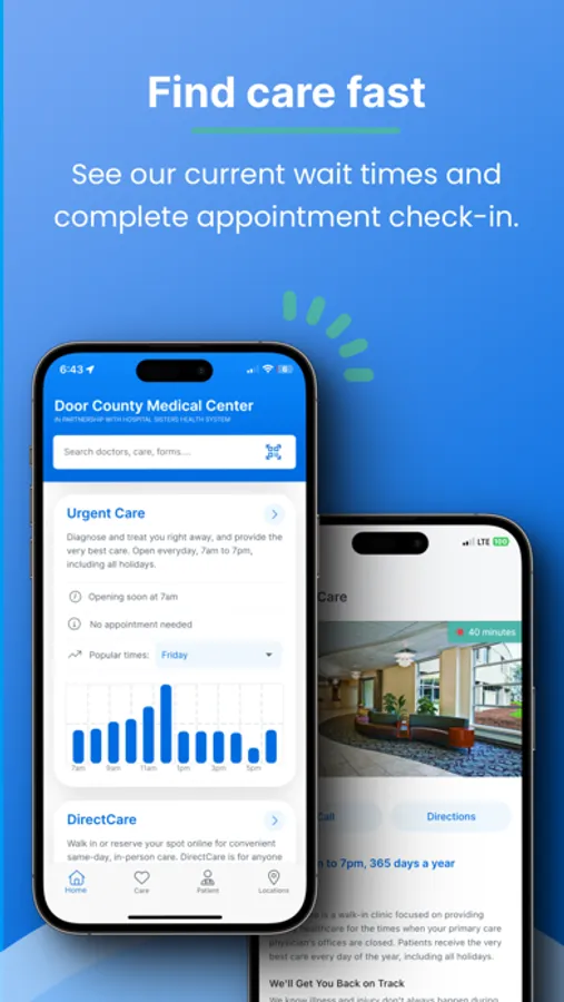 Introducing our innovative app that puts your urgent care needs at your fingertips! With our app, you can quickly and easily find the nearest care centers and view real-time wait times, so you can make informed decisions about where to go for the care you need. But that's not all - our app also allows you to schedule DirectCare appointments so you can skip the wait altogether and get the care you need on your schedule. Our app makes it easy to get the care you need, when you need it. Download our app today and experience a better way to manage your healthcare needs in Door County!