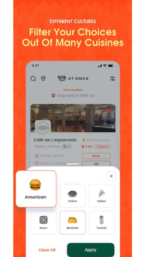 Whether you’re a foodie looking to explore new culinary delights or a restaurantownerlookingto growyourbusiness,ATONCEhaseverything you need to make your dining experience a success. Download the app today and start booking and discovering the best cafes and restaurants in Saudi Arabia.