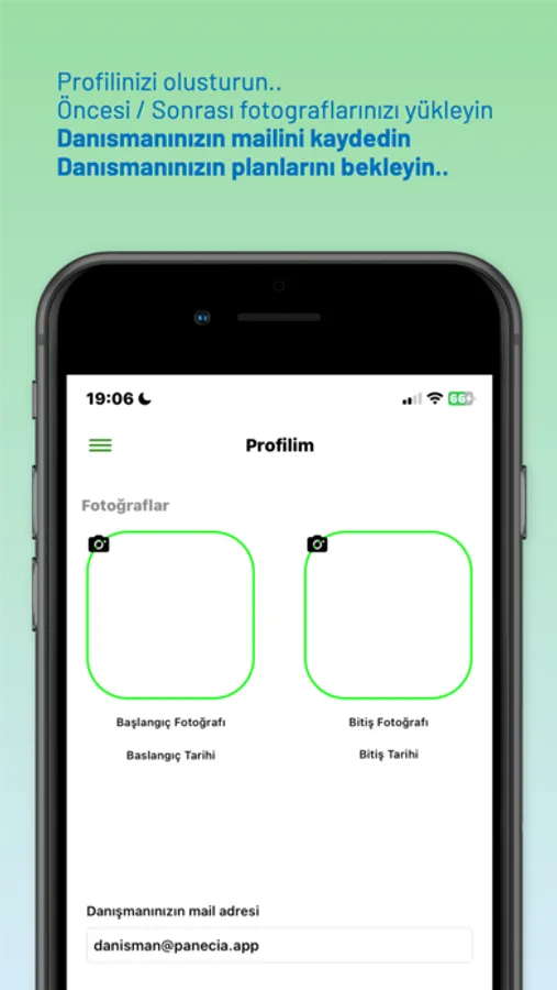 Danışan olarak giriş yapacaksanız ve henüz danışmanınızdan e-mail adresi gönderilmediyse, ilk etapta danisman@panecia.app adresini danışmanınızın mail adresi yerine tanımlayabilirsiniz. Danışmanınızdan e-mail adresi geldikten sonra profil ayarlarınızdan danışmanınızın size gönderdiği e-mail adresini tanımlayabilirsiniz.